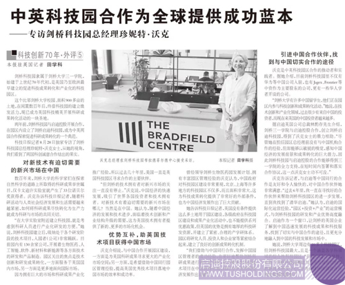 她說,劍橋大學周邊有10多個科技園區,但劍橋科技園最大,且是一個涵蓋各學科領域的綜合性科技園區。“引進中國合作伙伴,有助于劍橋科技園籌建與未來發展密切相關的新技術研發中心,并為全球科技園的合作和發展提供藍本。”
