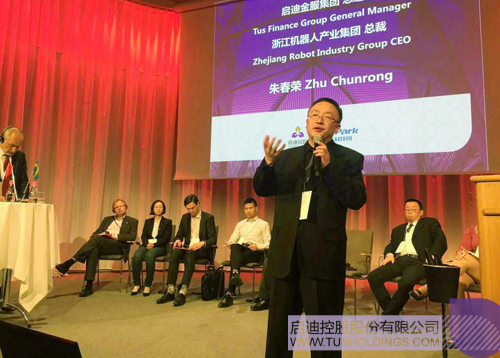 ▲ 啟迪金服總經理、浙江機器人產業集團總經理朱春榮在瑞典諾貝爾頒獎大廳演講