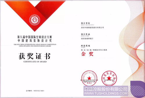 “中國(guó)建筑裝飾設(shè)計(jì)大獎(jiǎng)”售樓處空間工程類(lèi)金獎(jiǎng)證書(shū)及獎(jiǎng)杯