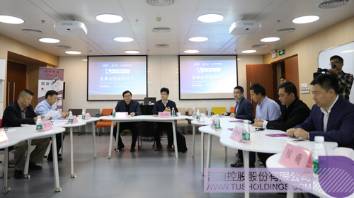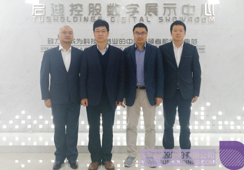 房漢廷副社長(左二)、劉峰總編輯(右二)座談會后參觀考察啟迪控股數(shù)字展廳